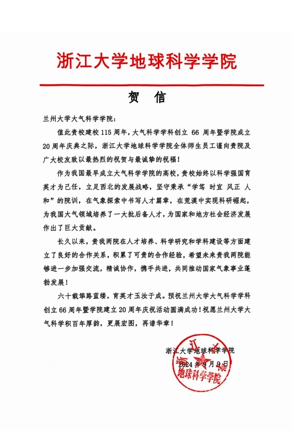 浙江大学地球科学学院致opta足球数据官网建院20周年贺信