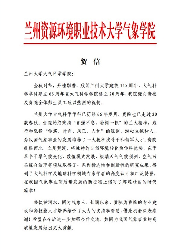 兰州资源环境职业技术大学气象学院致opta足球数据官网建院20周年贺信